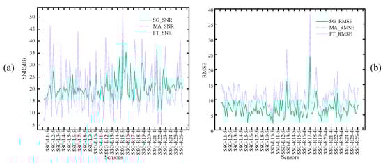 To demonstrate the superiority and applicability of SGS, we selected the moving average smoothing (MAS) [] and five-point cubic smoothing (FTS) [], which are relatively common in time-series data smoothing methods for comparison. And we used some indexes, including SNR and RMSE, to evaluate the smoothing effects. The SNR and RMSE for evaluating the smoothing impact are displayed in Figure 7a,b, respectively. And the two sensor smoothing results of SSG-L1 and SSG-R26 are shown in Table 2. It can be clearly compared that the SNR of MAS and FTS is distinctly smaller than that of SGS, and the RMSE of SGS is more significant than that of MAS and FTS. The main reason is that SGS allows direct specification of smoothing window sizes, making it suitable for signals of different frequencies. In contrast, the window sizes are fixed for FTS and MAS, which lacks flexibility. In addition, by calculating the mean values of SNR and RMSE across all sensors, it was found that the SNR and RMSE of SGS smoothing were superior to those of MAS and FTS by approximately 10% and 30%, respectively.
