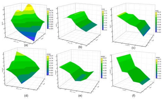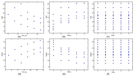 The relationship between multi-parameter and individual indicator. (a) SNR for different win_len and orders; (b) SNR for different win_len and delta; (c) SNR for different orders and delta; (d) RMSE for different win_len and orders; (e) RMSE for different win_len and delta; (f) RMSE for different orders and delta.