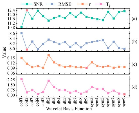 The evaluation of wavelets with different basis functions for SSG. (a) SNR, (b) RMSE, (c) r, (d) Tj.