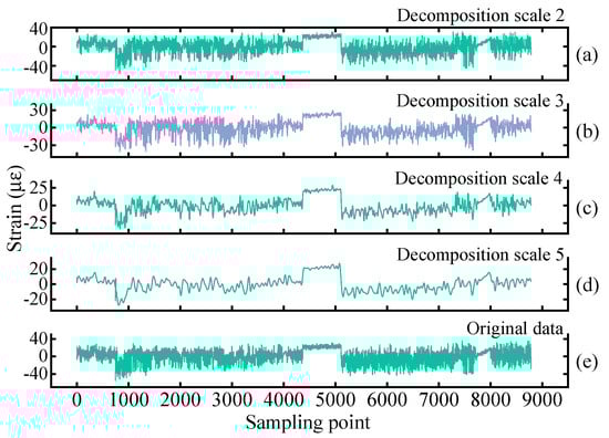The coupling effect of various factors often affects the tunnel structure, including traffic behavior and ambient conditions. Data transmission inevitably results in signal quality degradation, leading to significant noise in time-domain data. Thus, noise reduction processing is necessary for the data. Fourier transform for time-domain analysis and wavelet transform for time-frequency analysis are typical denoising processes. The Fourier transform is unsuited for non-stationary, non-linear signals and is less sensitive to time changes []. On the other hand, wavelet transform (WT) can handle both non-smooth and noisy signals effectively []. Wavelet transform can combine the benefits of time-domain and frequency-domain analysis methods and characterize the local features of the signal in time-frequency analysis. It is frequently used to denoise tunnel monitoring data [,,]. The results demonstrate the feasibility and effectiveness of applying wavelet transform to tunnel monitoring data processing. Based on these, this study will employ wavelet transform to reduce noise.