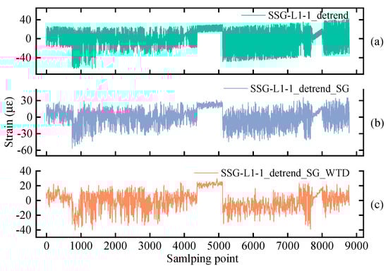 The selected wavelet basis functions and decomposition scale decomposes the original signal into its corresponding wavelet coefficients. The threshold compromise function was selected in this study to threshold the wavelet coefficients, followed by their reconstruction to obtain the denoised wavelet signal. The results of detrending, SGS and denoising are illustrated in Figure 13. By comparing Figure 13a,b,c, it can be obtained that an integrated method of SGS and WTD can effectively remove noise better than SGS and detrending, while preserving the characteristics of the original data. Moreover, the reconstructed data are essentially consistent with the measured data’s trend and singular point location. This suggests that the integrated method has notable benefits in reducing signal noise.