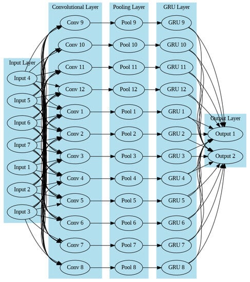 An artificial neural network is an initiative-taking system comprising many closely connected, nonlinear processing units, parallel, or “devices” that are very good at computing. Instead, it may be seen as a collection of flexible mathematical structures that can identify complex nonlinear connections between the datasets that are being input and those that are being produced [42]. A typical neural network is made up of many elementary processing units that are coupled and known as neurons. Each neuron produces a series of activations that have real-world values. Sensors in the environment turn on input neurons layer, convolutional layer, pooling layer and GRU layer neurons connected with output layer (see Figure 2).