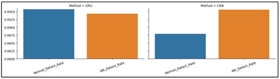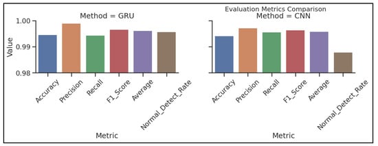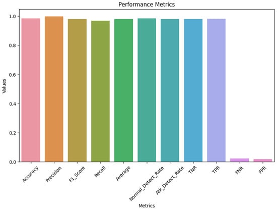 Figure 13 compares the proposed method overall accuracy, precision, recall, and to those of the other algorithms. The simulation results reveal that the suggested method achieved an accuracy of 99.7%, a precision of 98.1%, a recall of 99.9%, and an of 98.9%, respectively. GRU all attained an accuracy of 98.6%, a precision of 99.5%, a recall of 97.4%, and an of 98.5%. CNN had a recall rate of 97.3%, an accuracy rate of 98.5%, a precision rate of 99.8%, and a score of 98.5% on the scale. The LSTM achieved an accuracy rate of 98.5%, a precision rate of 99.9%, a recall rate of 97%, and an of 98% FPR. In every category except for recall, the suggested model performed much better than the other algorithms. The algorithm’s strong focus on generating false positives (FP) was the reason behind the decrease in recall achieved with the suggested method. The higher number of FP contributed to the denominator in the recall calculation, leading to a decreased recall value.