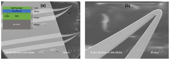 (a) SEM image of two AlGaN/GaN single-channel triangular microcantilevers with heights of 330 µm (left) and 300 µm (right), used for airflow detection. The inset shows the layered structure of the epitaxial wafer used for fabricating the sensors; (b) Magnified SEM image of the cantilever shows the details of the microcantilever apex.