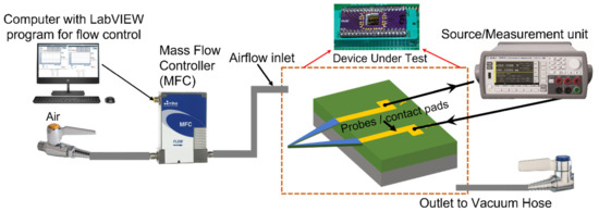 For airflow testing and characterization, the sensor chip was attached to a custom-designed printed circuit board (PCB) chip carrier, and the metal contact pads were wire-bonded to external leads of the PCB (see Figure 2 inset), which were biased using a source measurement unit (SMU, Keysight B2902 A). The microcantilever sensor was biased at a constant dc voltage of 10 V during measurements to maintain a steady-state temperature at the apex of the microcantilever. The current responses at different flow rates were recorded using the SMU. The thermal profile of the microcantilever at different bias voltages was recorded by an Inframetrics SC1000 Thermacam FLIR forward-looking infrared video camera, which indicated variation in the temperature profile under various biasing conditions.