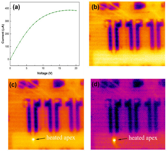 (a) I–V characteristics for the triangular microcantilever sensor 1. The current is found to saturate beyond 10 V. Thermal camera images for different voltage biases: (b) 0 V, (c) 10 V, and (d) 20 V. Heated apex of the microcantilever is pointed out by arrows in (c,d).