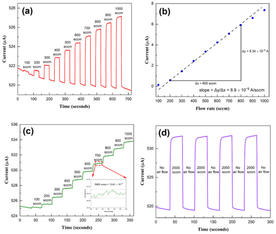 To investigate the capability of the microcantilever sensor in sensing air flow, it was initially exposed to airflow rates varying from 100 to 1000 sccm, with a step size of 100 sccm and a sequential pause (flow rate reduced to 0) after each flow test level. The sensor’s responses to these airflow rates are shown in Figure 4a. We observe an envelope to the sensor response, which is likely caused by the charge instability typically observed in III-Nitrides [33,34]. Since this is contributed to a large extent by the bare surface, passivating the surface using a coating of SiNx can be very useful in reducing such transients [35,36]. The sensor response, i.e., change in current magnitude, corresponding to each flow rate, has been plotted against the flow rate in Figure 4b. We find that the current change varies linearly with the airflow, increasing at a rate of ~8.9 nA/sccm. The sensor response was also recorded when the airflow rate was varied continuously from 100 to 1000 sccm without an alternate reset to zero flow rate, and the responses are shown in Figure 4c. The inset of Figure 4c shows the RMS noise for the 700 sccm step. To test the repeatability of the sensing response, multiple cycles of 2000 sccm flow rates, followed by a reset to 0 sccm, were recorded, and the responses are shown in Figure 4d. We find the sensor responses for the two to be practically identical, which highlights their stability and repeatability. The response of another sensor with airflow varying from 300 sccm to 1000 sccm is shown in Figure S2a, with flow pauses after each flow level. The response was also recorded with the airflow rate varied as a step function from 300 to 1000 sccm, without any reset to 0 sccm, as shown in Figure S2b. Figure S2c shows repeatable sensor response at multiple 2000 sccm flow cycles with airflow paused in between. Once again, excellent stability in responses can be observed.