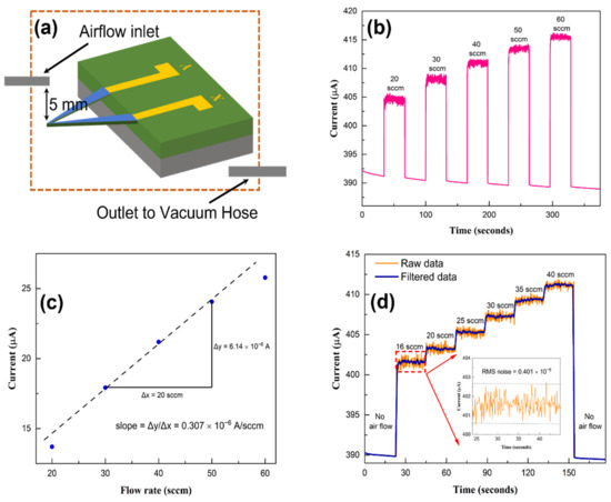 The sensor response was also tested for lower flow rates in the range of tens of sccm. For this, a reduced-diameter (0.53 mm) flow tube was used, with closer positioning of the sensor from the tube end, to enhance the velocity of the air reaching the cantilever sensor. This helped to increase the rate of heat loss from the cantilever apex, enhancing the flow-sensing response of the microcantilever. It should be noted that a larger diameter tube (6.35 mm) was used for the higher flow rate sensing since a high flow rate with a narrow diameter tube would result in large mechanical stress and potential damage to the microcantilever sensor. Nonetheless, this method of adjusting the tube diameter and distance can be very useful in tuning the dynamic range and sensitivity of the sensor. Figure 5a shows a schematic diagram showing the narrower air flow tube in close proximity (5 mm away) to the microcantilever to enhance its detection sensitivity. The microcantilever sensor was exposed to varying airflow rates, from 20 to 60 sccm, in increments of 10 sccm, and the responses are shown in Figure 5b. The current change responses of the sensor as a function of the airflow rates are shown in Figure 5c. Figure 5d shows the sensor response for airflow rates varying from 16 sccm to 40 sccm at even smaller increments of 5 sccm. The inset of Figure 5d shows a magnified plot of the first flow rate (16 sccm) step, where the random fluctuations in current (due to a combination of air flow turbulence as well as sensor temperature fluctuations and mechanical vibrations) are shown magnified. This plot is used to determine the root-mean-squared (RMS) current noise, which is determined to be 0.401 μA.