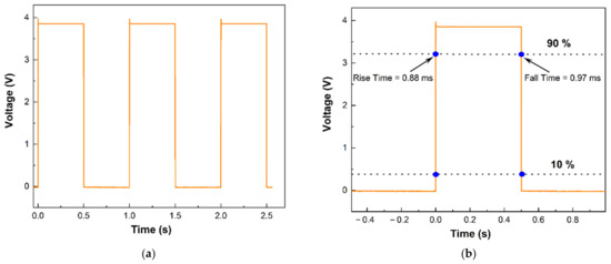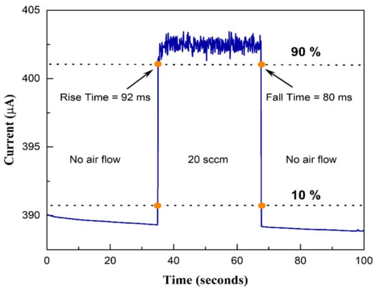 Another critical parameter to characterize a sensor is its response time, which is defined as the time required to reach from 10% to 90% of its final response. To determine the response time, we plotted the response of the sensor for 20 sccm air flow (from Figure 5b) in Figure 6. We find that as the 20 sccm of airflow was introduced, the sensor took 92 ms (τrise) to reach from 10% to 90% of its final response, and it took 80 ms (τfall) to reach from 10% to 90% of its final recovery. The response time, however, includes several factors, including the response time of the MFCs, the flow delay in the tube and in the chamber, and of course, the response time of the sensor itself. The response of the sensor itself will be typically limited by the thermal time constant of the microcantilever, which can be as low as tens of µs for heated microcantilever tips [43,44]. To verify that the thermal time constant is indeed much lower than the response time we observed in Figure 6, we applied voltage pulses to the sensor (0 to 10 V, with 50% duty cycle and 1 Hz frequency) and plotted the sensor response as a function of time in Figure 7a. Note that the sensor response is the voltage measured across a resistor (1 kΩ) in series with the sensor, which is proportional to the current flow. This was performed to measure the current pulse with high temporal resolution using a digital storage oscilloscope. Figure 7b shows the magnified image of a sensor response. The response (rise) and recovery (fall) times extracted from the pulse are 0.88 and 0.97 ms, respectively, which are indicative of the thermal response time of the sensor. The intrinsic sensor response time will also be similar to these times and can be expected to be a few ms. This is also in agreement with the typical time constants of thermal flow sensors reported in the literature [45,46]. Comparing the overall performance metric of our flow sensor to that of other flow and velocity sensors reported so far, we find that it performs very well in terms of low power consumption and flow velocity measurement, as well as intrinsic response time. In terms of flow volume measurement, although there are other specialized sensors that have yielded lower flow rate measurement capabilities even below 1 sccm [47,48], their geometry is typically more complicated [49] with an integrated heater coil and two thermistors on two sides. The performance of our sensor, with its very simple geometry, can still be desirable in many applications due to its very small active area and simple two-terminal measurement.