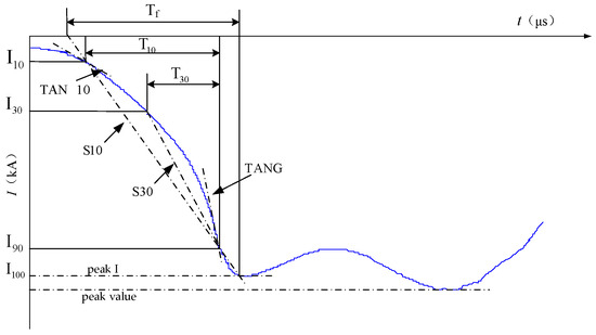 The peak I in the figure is the first peak of the lightning current amplitude (kA); the peak value is the maximum value (kA) of the lightning current amplitude; Tf is the wave head time (μs); Tt is the duration of the lightning current from zero to half peak, which is the wavelength time (μs); T10 is the time when the value of peak I increases from 10% to 90% (μs); T30 is the time when the value of peak I increases from 30% to 90% (μs); S10 represents the average rate of increase in the peak I value from 10% to 90% (kA/μs); S30 represents the average rate of increase in the peak I value from 30% to 90% (kA/μs); and TANG is the maximum rise rate of the current waveform (kA/μs). It can be noted that before the current reaches the peak value, there is an obvious concave surface at the maximum gradient of the waveform. Some scholars believe that the concave surface is formed because the downward negative leader is not connected with the connecting leader at the initial stage of lightning development, and the discharge phenomenon is weak. Therefore, the lightning current waveform has a low gradient. When the two are connected, the instantaneous strong discharge phenomenon occurs, and the maximum gradient of the waveform generally occurs at this time. When the subsequent return lightning discharges along the channel of the first return lightning, its waveform will not appear concave [22].