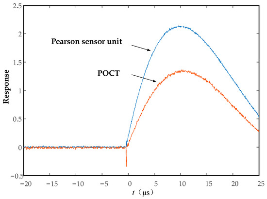 The impulse current waveform obtained from the Pearson sensing head unit and POCT is shown in Figure 4.