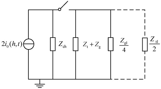 The equivalent circuit of lightning striking a tower is shown in Figure 6. I0 (h, t) is the current, assuming that the equivalent impedances of different conductors match each other, that is, the contact point does not reflect, which is called the ideal current. When the switch is closed, lightning strikes the tower. Part of the lightning current enters the ground along the base tower, and part of the lightning current is transmitted to the adjacent tower through the lightning wire. After flashover of the insulator string caused by the lightning stroke, the shunt effect of the broken phase conductor shall also be considered, as shown in the dotted line in Figure 6.