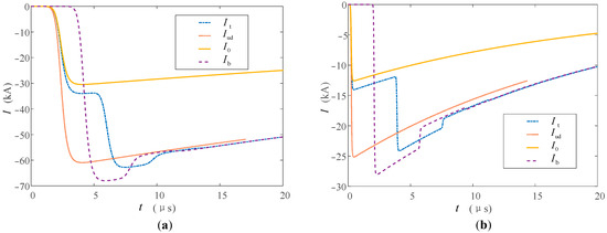 Comparison of current waveforms between iI(t) and i0(t) when lightning strikes the top of the transmission tower with flashover; (a) flashover occurs before the peak and (b) flashover occurs after the peak.