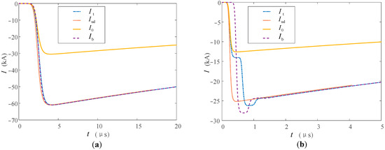Based on the above considerations, it is assumed that the time when the lightning traveling wave reaches the tower top is the zero moment of back-flashover analysis. The insulator flashover occurs after time from the zero moment. When , the current distribution of the lightning channel after the back-flashover can be expressed as follows: