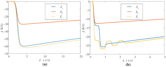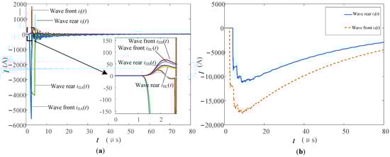 As can be seen from Figure 24b, the amplitude of the lightning current acting on the insulator at the moment of the wave front and back flashover is large, so the amplitude at the moment of flashover is large. In addition, the i3(t) waveform presents the characteristics of stepping up and then oscillating down due to the lightning current connected to the tower at the moment of the flashover, and the changing trend of the waveforms is consistent.