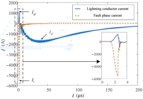 The lightning current at the tower top is shown in Figure 20a. After the tower top is struck by lightning, there is a large lightning current flowing through the type I monitoring point as it is in front of the diverging channels. Therefore, iI(t) has a larger amplitude of 10.5 and 14.5 kA, and the polarity is the same as the lightning current. The insulator flashover current is shown in Figure 20b. Different amplitudes cause different moments of insulator flashover. Since the flashover time is near the wave peak, there is no process of rising amplitude after the flashover, and the attenuation starts from a relatively large value. Compared with the type I monitoring point, the waveforms of the two groups showed the same changing trend, and the responses were smaller, with the maximum peaks of about 4260 and 2850 A, respectively. In addition, due to the high peak value and relatively small response at the flashover time, the influence of uj″(t) in the formula is particularly serious and the amplitude of oscillation is large. The lightning current in the fault phase is shown in Figure 20c, because the lightning current measured at the type II monitoring point on fault phase A is transmitted to the line through the insulator. Therefore, the waveform characteristics and variation trend of iIA(t) are consistent with those of i4(t − t0) under two kinds of lightning current strikes. However, the overall response is smaller than that of i4(t − t0) due to the shunt effect.