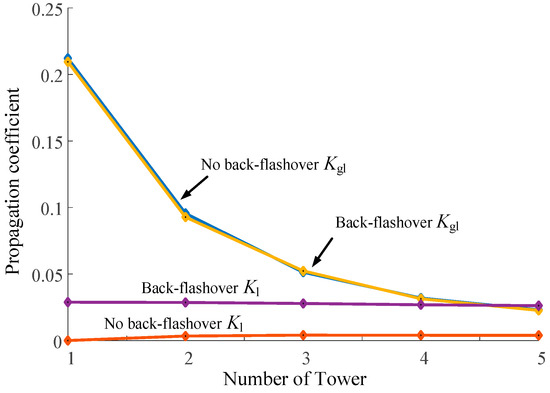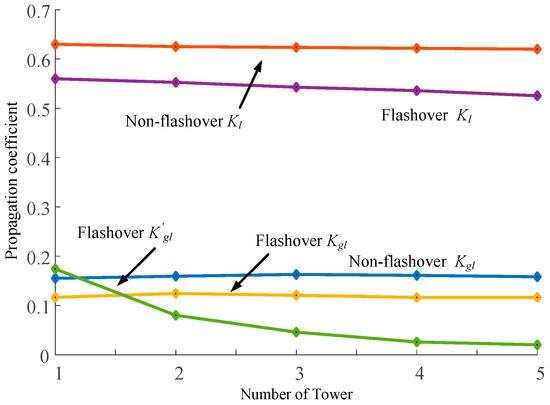 As can be seen from Figure 17, in the case of no back-flashover, the lightning current propagation of the lightning protection line will also be affected by the tower shunt. The initial value of Kgl is relatively large, about 0.21, and it will be significantly reduced after each tower passes through one base, about 0.02 after passing through five base towers. Because the lightning current of the transmission line is coupled, the initial value of Kl is small and the overall changing trend is small, about 0.004.