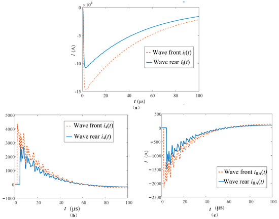 The results of normalization of iIIA(t) and i0(t) are shown in Figure 25. The iIIA(t) current under the two types of flashover conditions will have small oscillations under the influence of uj″(t). The waveform of the lightning current is similar than that of the circuit without flashover. iIIA(t) can measure part of the rising edge information of the lightning current upon wave front flashover. iIIA(t) can measure the rising edge information of the lightning current, including the peak value when the wave is in flashover behind the wave.