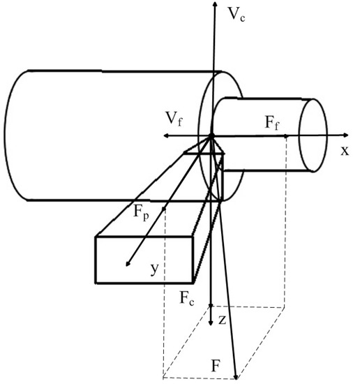 where χ1, χ2, χ3 are the coefficients of decomposition of the cutting force F on the axis of deformation of the tool. The Fc component has the greatest value here, which most accurately reflects the cutting force itself, and determines the vibration activity of the tool in the direction of the z axis. The force itself, which prevents the shaping movements of the tool, can be represented as the product of the cut layer area by some indicator characterizing the chip pressure on the front face of the cutting wedge of the tool, as presented in the expression below [20,21,22,23,24,25]: