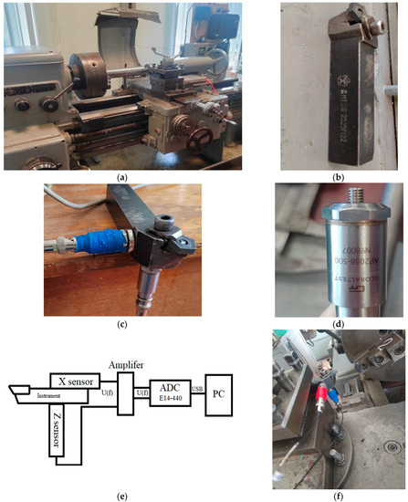 The measuring system: (a) the upgraded 1K625 machine, (b) the tool, (c) the tool with vibration converters AP2098-500, (d) the vibration converter AP2098-500, (e) the ADC and signal amplifier with a vibration converter, and (f) the measuring system on the machine.