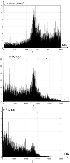 As can be seen from Figure 4, the integration technique we have adopted, as a whole, adequately converts the vibration acceleration signal into a vibration velocity and vibration displacement signal, in the direction of the z axis. However, to verify the correctness of the obtained solution, at every step of the experiment, we carried out a comparative analysis of the signal spectra shown in Figure 4. The results of such a comparison are presented in Figure 5, in the form of the power spectra of the vibration acceleration signals, vibration velocity, and vibration displacement of the tool tip, in the direction of the z axis.