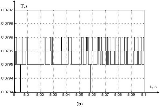 As can be seen from Figure 7, the value of the actual feed fluctuates significantly in the vicinity of the set value; we observe similar fluctuations in the calculated value of the delay time constant. For a more adequate analysis of the actual value of the feed, we will consider the calculated value of the vibration power of this value, for the calculation of which we somewhat transform Expression (6), removing the value of the average component of the feed from it:
