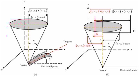 In this study, the angle β was classified as follows: when it is greater than 0 degrees but less than 20 degrees, it is identified as a flat terrain; when is greater than or equal to 20 degrees but less than 50 degrees, it is recognized as a sloping terrain; otherwise, it is considered as a steep terrain. All three types of terrain (flat, sloping and steep) were selected to determine the threshold of θ angle—a crucial parameter in the cone model—whose range can be determined using Equation (7).