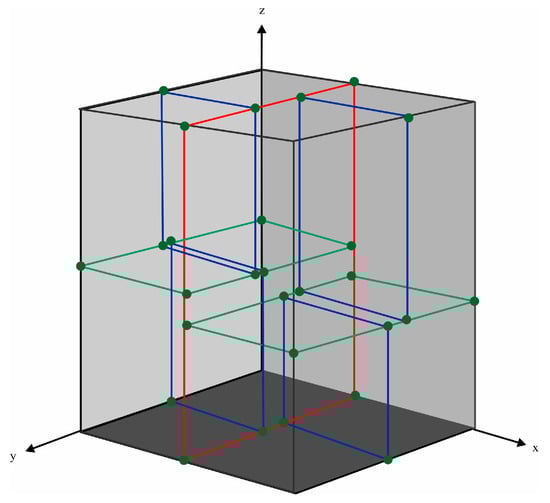 The segmentation order is determined based on the variance of the point cloud in x, y and z dimensions. The hyperplane is then utilized to partition the space. For instance, as illustrated in Figure 3, the x-axis served as the initial segmentation dimension. The median is selected as the root node of the tree and utilized to divide the space into two parts with a red frame. Subsequently, the z-axis serves as the segmentation dimension, and further division of space is carried out using a green frame. Finally, by using the y-axis as another segmentation dimension, four subspaces are subdivided into eight subspaces with a blue frame to form leaf nodes. In this manner, recursive selection in each designated dimension yields both final leaf nodes and root nodes.