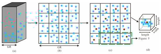 Firstly, the virtual grid that has already been segmented is further subdivided into smaller voxels, as illustrated in Figure 4a,b. Voxel size should be chosen to be larger than the resolution of the raw PCD and smaller than the GR, ensuring that each voxel grid contains at least one point. Equation (4) is used to calculate the centroid of all points within each voxel grid. The red point in Figure 4c is the calculated centroid of points in each voxel grid.
