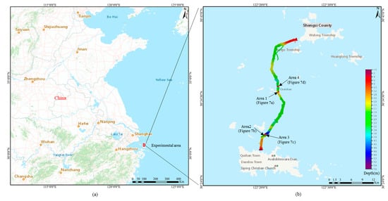 The data utilized in this study was obtained from a project conducted in the sea region of Zhejiang Province, China, as depicted in Figure 6a. The multibeam bathymetric data were acquired using a Reason SeaBat T50-P shallow-water multibeam sonar system with a beam opening angle set at 120 degrees and containing 512 beam points per ping. Navigation and positioning system were facilitated by the POS MV OceanMaster from Applanix Canada, while real-time sound velocity profiles were collected using the MTNOS X SVPT from AML Canada. GNSS tide measurement was used to obtain accurate dynamic tidal levels []. The water depth of the whole measurement area ranged from 2.40 m to 53.90 m, as shown in Figure 6b.