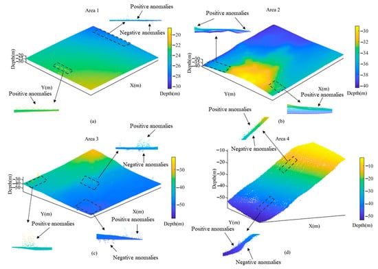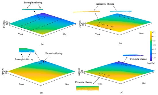 The acquired multibeam bathymetric data was pre-processed using CARIS HIPS 11.3 software, which includes sound velocity correction, installation deviation calibration, navigation attitude correction and tidal level correction. Subsequently, the raw PCD was outputted and four representative areas were selected for detailed depiction, including Area 1 characterized a flat terrain as shown in Figure 7a, Area 2 featuring a sloping terrain as shown in Figure 7b, Area 3 comprising a mixed terrain as shown in Figure 7c and Area 4 containing a steep terrain in Figure 7d. The mixed area encompasses flat, sloping and locally steep terrain, representing a common complex seafloor topography. Collectively, Area 1 comprises 75,283 bathymetric points; Area 2 comprises 59,799 bathymetric points; Area 3 comprises 186,660 bathymetric points; and Area 4 comprises 85,005 bathymetric points.