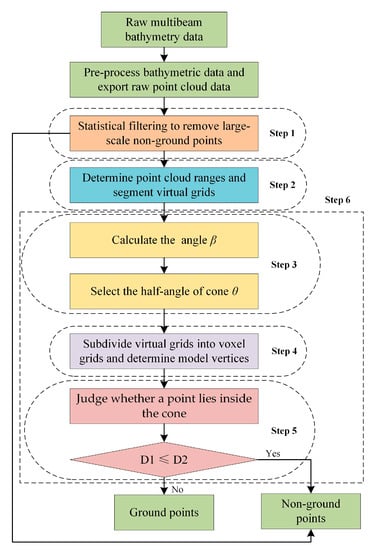 In general, the aforementioned methods can provide effective filtering in areas with relatively flat terrain. However, when confronted with complex and variable seabed terrain, it is challenging for one single method to achieve desirable filtering results [,,]. Typically, varying degrees of excessive or incomplete filtering may occur. In this paper, a cone model filtering (CMF) method based on an improved tornado algorithm is proposed in attempt to address the above issues. The method mitigates the occurrence of excessive filtering in areas with intricate underwater terrain by introducing virtual grids and voxel down-sampling.