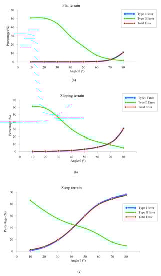 As illustrated in Figure 9c, the steep terrain was more sensitive to the change in θ angle than the other two terrains. As the θ angle increased, the Type I and Type II errors showed more variation, especially the Type I error. This is because the β angle of the steep terrain was very large, and as the angle of the model continues to increase, it will lead to the deletion of more sloping ground points, i.e., the phenomenon of excessive filtering. Therefore, it is recommended that the θ angle should not exceed 20 degrees to avoid excessive filtering for steep terrain.