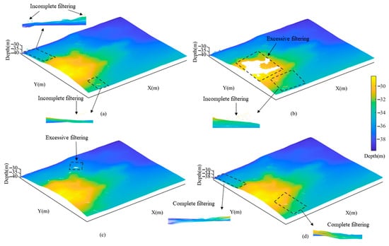 In Area 2, the CUBE method exhibited incomplete filtering as shown in Figure 11a. While both the TSF method as shown in Figure 11b and the CSF method as shown in Figure 11c demonstrated excessive filtering, the latter achieved a more optimal filtering effect. The former showed the most obvious degree of excessive filtering, as the fitted trend surface did not reflect the complex seafloor topography well. The CMF method achieved the optimal filtering results as shown in Figure 11d due to its refined parameter selection strategy that effectively reduced θ angle and increased vertex numbers.