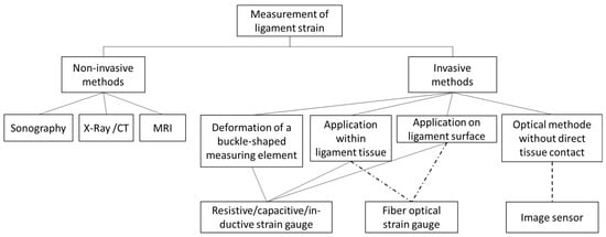 Figure 1 presents a classification of methods utilized for measuring ligament strain in both clinical routine and medical research. In clinical routine, non-invasive methods are employed to measure ligament strain. The use of magnetic resonance imaging (MRI) and computed tomography (CT) within a surgical intervention requires significant technical and financial resources. As such, these two techniques cannot be deemed suitable for interoperative strain measurements since they fail to meet objective No. 7 in Table 1. Sonography, although technically less complex with new techniques for tendon-motion tracking as seen in [], achieves a high accuracy of up to 0.05 mm (mean average error). However, these do not meet the measurement accuracy requirements outlined in Section 2.2 for the planned application. Consequently, we exclude non-invasive methods from our screening.