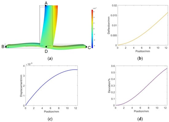 Simulation analysis results of the T−beam. (a) Diagram of T−beam deformation. (b) Axial deflection distribution of section AB. (c) Axial displacement distribution of the AB section. (d) Measurement deviation caused by bending of the beam.