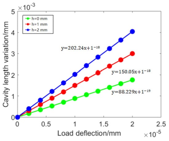 In addition to the sensing length L, the simulation results show that the height h of the optic fiber is also the main factor affecting the static performance of the sensor. When L is 3 mm, a horizontal displacement is applied to point A, and the variation of the axial displacement measured by the sensor with h is shown in Figure 4. The higher the height of the optic fiber, the greater the displacement; moreover, changing the height h of the probe does not affect the angle between the reflecting surfaces, so it can be achieved within the range of the balance. Increasing the probe height h not only improves the sensitivity of the sensor but also does not result in an increase in measurement deviation.