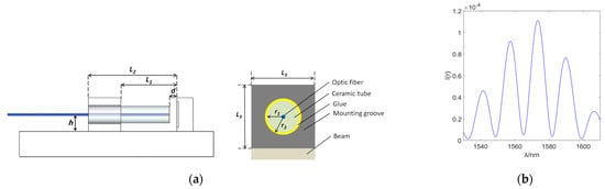 The structure of the F-P displacement sensor is shown in Figure 5a. Based on the balance design requirements and simulation analysis results, the final sensor design parameters are shown in Table 2. The manufacturing process is as follows. Firstly, to protect the optical fiber and prevent fiber bending, a ceramic tube is used to encapsulate the single-mode optical fiber. Due to the low coefficient of thermal expansion of optical fiber materials and ceramic materials, the temperature effect of the sensor can be avoided as far as possible. Secondly, the optical fiber installation slot is processed at a position 3 mm from the beam root, the packaged optical fiber is inserted into the installation slot, and the reflector is installed in the vertical plane with the root of the T-beam. The optical fiber installation slot is drilled in advance, and the aperture matches the external diameter of the ceramic packaging tube to ensure the stability of the sensor after installation. After inserting the optical fiber into the installation slot, the F–P cavity length d can be adjusted by moving the fiber end back and forth through a micro-displacement device. During this process, observing the reflection spectrum of the sensor can monitor the changes in cavity length d. After adjusting the cavity length, fix the encapsulated optical fiber with epoxy resin adhesive. The F–P sensor has a simple structure, high sensitivity, and does not require the application of pre-stress during installation, avoiding the impact of pre-stress relaxation on sensor performance. The reflection spectrum of the F–P displacement sensor after production is shown in Figure 5b.