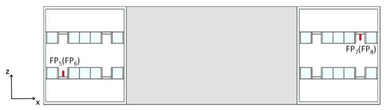 The loads measured by the three-component optic fiber balance are the axial force (FA), normal force (FN), and pitch moment (Mz) on the aircraft or spacecraft model. The installation positions of the eight F–P displacement sensors used in the balance are shown in Figure 6. Based on the working principle of the balance and the deformation characteristics of the sensitive components under different loads, the sensors are installed on four T-beam measuring elements, and each sensitive element is symmetrically arranged with F–P displacement sensors; this is mainly for temperature compensation. Since the deformation trend of the upper and lower symmetrical planes of the T-beam structure is opposite under the aerodynamic load (one plane is stretched, the other is compressed), and the positive and negative trends of the output caused by the thermal output of the sensor itself and the thermal expansion of the structure are the same, the temperature self-compensation can be realized by the way of bridge assembly output by arranging the sensor in the symmetrical position of the beam structure. The outputs of two sensors symmetrically arranged in the T-beam measuring element can be represented as: