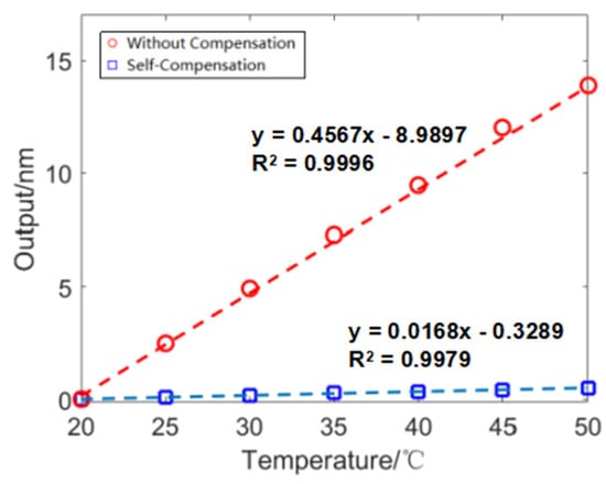 The compensation of the thermal output of wind tunnel balance has always been an important issue in balance force measurement technology. In wind tunnel experiments, the force balance is generally placed inside the model to prevent it from being affected by external heat flux. However, in conventional continuous wind tunnel aerodynamic tests, due to the long test time, the model and support rods are affected by the airflow and transfer heat to the wind tunnel balance, resulting in an increase in the temperature of the balance and sensors, resulting in thermal output. The pulse wind tunnel test time is less than 1 s, and the model size is large. During the wind tunnel test, the temperature transfer effect was relatively small. However, during the long-term calibration process, changes in environmental temperature can also cause thermal strain on the balance and the thermal output of the sensor. To ensure the accuracy of subsequent static calibration tests and evaluate the compensation effect of temperature self-compensation methods, temperature calibration tests were first conducted, and the calibration results are shown in Figure 7. After self-compensation, the temperature sensitivity decreases by about 97.4% compared to a single F–P sensor. When the bridge is output, the temperature sensitivity of each component of the balance is shown in Table 4. The compensation accuracy of the balance’s three-component thermal output is higher than 93.3%. At the same time, according to the balance output formula, the aerodynamic load output is four times the output value of a single sensor, further reducing the proportion of the balance’s thermal output.