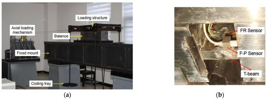 Optic fiber balance calibration test: (a) balance calibration device and (b) sensor layout.