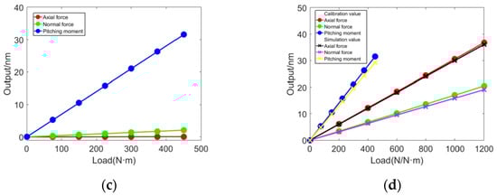 The calibration results of the optic fiber balance are shown in Figure 10. Under single-component loading, the linearity between the output of the balance and the load is good, both higher than 0.9993. The comparison between the calibration data of the optic fiber balance and the output values of the simulated balance is shown in Table 5. The error between the output sensitivity of the three components of the optic fiber balance and the simulation value is less than 6%, which is basically consistent with the simulation analysis results. This verifies the feasibility of the design method of the force balance based on F–P displacement measurement.