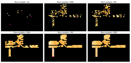A set of NSIs is produced, each employing one UE radio variable per RGB color layer (i.e., RSRP, RSRQ, and SINR), with the intensity being directly mapped based on the normalization of potential values. Three pixel sizes (1, 5, and 10 m) are selected, the choice of which hinges on the accuracy of the localization method in a real environment. As earlier stated, the acquisition time is directly proportional to the pixel size necessary to fill the majority of the image. This condition could lead to an insufficient number of samples for a given pixel size acquisition time, for instance, 10k samples with a 1 m size.