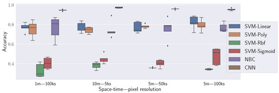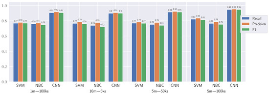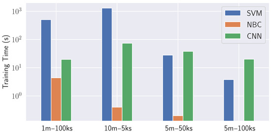 In terms of training time, the proposed image-based CNN approach is superior to SVM and NBC. All algorithms and configurations are tested on an Intel Xeon processor server with eight cores and a processing speed of up to 2.4 GHz per core. As illustrated in Figure 5, CNN demonstrates shorter training times compared to SVM and NBC, barring the 10 m–5 ks configuration, where they are almost equivalent.