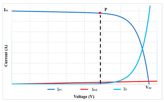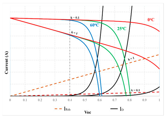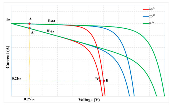 The graphs of Equations (3)–(5) are shown in Figure 2. In which the nonlinear region on the I(V) curve is caused by the ID current. In contrast, the slope in this area is mainly due to the IRsh current. However, these operating zones are affected by radiation and temperature (Figure 3). Furthermore, under the same operating conditions, its slope depends on the Rsh value (Figure 4). Therefore, surveying the working regions of PV modules under different operating conditions will simplify calculating their parameters.