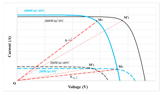 The working areas of the I(V) curve in Figure 3 show that the dmp2 value (at M2) is suitable for calculating Isc under all operating conditions. Because the resistance value of the PV system at 1000 W/m2—60 °C (Rin_2) belongs to line OM2, it always intersects the linear region of the curves. In contrast, dmp1 was chosen as the reference limit to calculate the Voc value of the PV system.