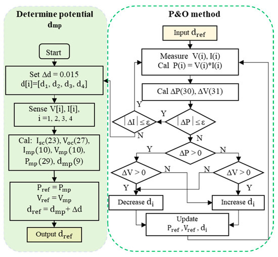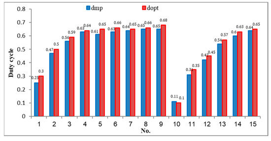Equation (15) shows that the relationship between dmp1 and dmp2 under the best and worst operating conditions is established based on the technical characteristics of the PV module. To reduce the pressure on the DC/DC converters switches, the dmp values should be around 0.5 [25,26]. To satisfy all operating conditions within this survey limit, duty cycle values must be satisfied as in (16).