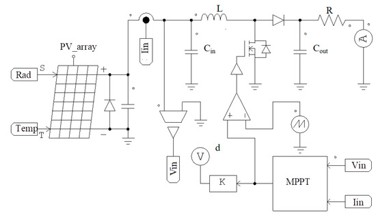 The boost converter in Figure 5 provides maximum power to the load. The MPPT block controls the DC/DC converter to keep the system working at the highest PV efficiency by adjusting the output voltage (Vout) according to the input voltage (Vin) through a duty cycle (d) value (0 < d < 1). The relationship between the input and output voltages is presented in (6) [22,23].