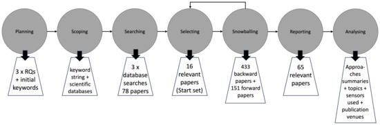 A systematic literature review [57,58,59] is the method chosen to study the topic, and it contains a set of steps: planning, scoping, searching, selecting, reporting, and analysing. A preliminary execution of the method has already been published [23], whereas as an extension to the method, a snowballing search complements the results reported and analysed in this work (cf. Figure 1).