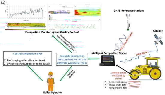 Intelligent compaction [1] (IC) is a process that utilizes vibratory rollers equipped with various sensors to automatically control and monitor the compaction level of geomaterials during road construction. The data gathered by these sensors is processed in real-time to display intelligent compaction measurement values (ICMVs), refs. [2,3,4,5,6,7,8,9], which are used to estimate the compaction state (i.e., density) of the material layer that is being compacted. The goal of IC is to improve the uniformity and consistency of the compaction process, leading to high-quality and long-lasting road pavements. In practice, newly laid road material layers are generally levelled using a grader and then compacted using a roller until the target density is reached. At the end of the compaction process, the density of the compacted layer is measured using spot density tests at randomly selected locations as part of the quality control and quality assurance process. Over the past few decades, various field studies have been undertaken to develop correlations between ICMVs and material density; however, an acceptable correlation has not yet been demonstrated for road materials [3,8].